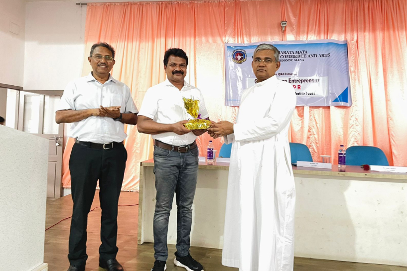 The “Coffee with an Entrepreneur” program was held at Bharata Mata College of Commerce and Arts, Chundy. Jointly organized by IQAC and the ED Club, the event featured a keynote speech by Mr. Bijoy P.R., Managing Director of Ponkathir Food Products. The session was presided over by Principal Prof. Dr. Siby Mathew. College Executive Director Rev. Fr. Jacob Puthussery and program coordinators Jomol Varghese and Rosna T.J. also spoke at the event.